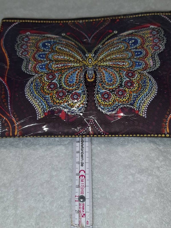 Hübsche Diamond Painting Handtasche als Teilmotiv mit tollen Glitzernden Steinen. Nur der Schmetterling wird gelegt, die Verzierungen ringsum sind gedruckt.